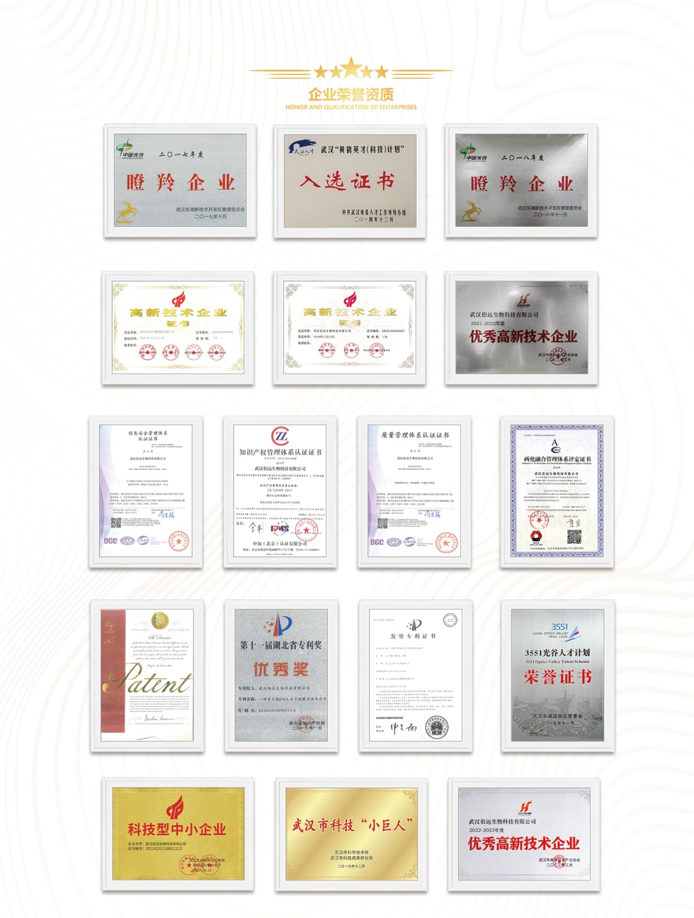 伯遠生物于2013、2016、2019年連續獲得“國家高新技術企業”認證,2017至2019年連續獲得“瞪羚企業”認定,并入選武漢“黃鶴英才(科技)計劃”,2019年入選“3551光谷人才計劃”,2020年再次入選武漢“黃鶴英才(科技)計劃”,2021、2022年獲得武漢市“優秀高新技術企業”認定;2022年獲得“武漢市企業開發中心”認定;2023年通過湖北省“專精特新中小企業”認定。