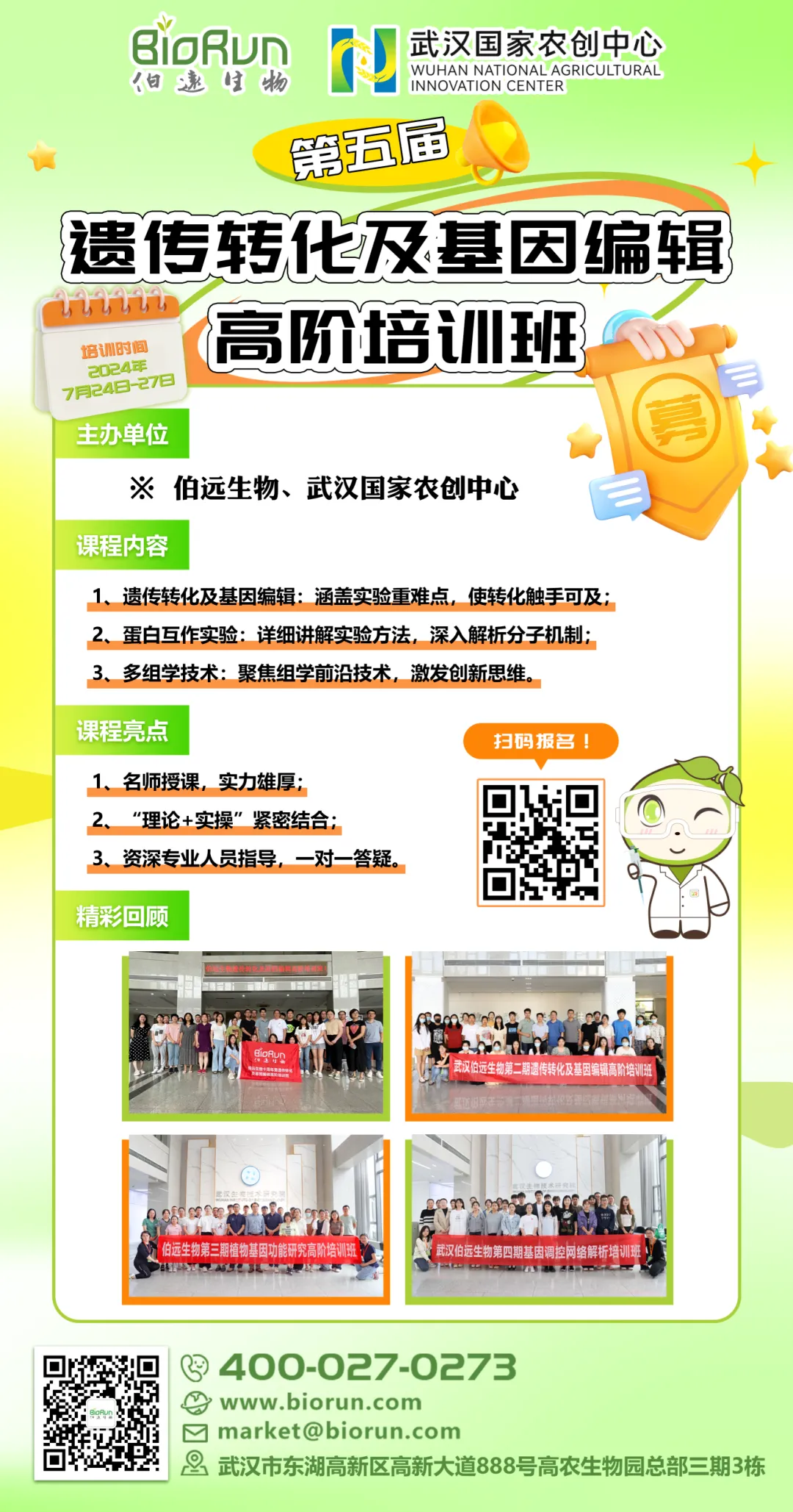 為進(jìn)一步強(qiáng)化分子育種等新興產(chǎn)業(yè)的集聚效應(yīng),幫助行業(yè)人員理解掌握基因功能研究所涉及的相關(guān)實(shí)驗(yàn)技能,解決日常研究中的困惑,并為推動(dòng)解決我國(guó)在生物育種、基因編輯等方面存在的卡脖子技術(shù)難題獻(xiàn)上一份綿薄之力,伯遠(yuǎn)生物聯(lián)合武漢國(guó)家農(nóng)創(chuàng)中心預(yù)計(jì)在2024年7月24日-27日舉辦第五屆遺傳轉(zhuǎn)化及基因編輯高階培訓(xùn)班。本次培訓(xùn)班基本涵蓋基因功能研究全套實(shí)驗(yàn)內(nèi)容,同時(shí)分享最新的研究成果與前沿知識(shí),為行業(yè)內(nèi)企業(yè)及從業(yè)人員提供一個(gè)共同學(xué)習(xí)、交流的平臺(tái)!